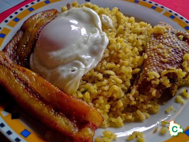 Servir el arroz (con verduras y charque) con un huevo estrellado y dos lonjas de plátano frita.